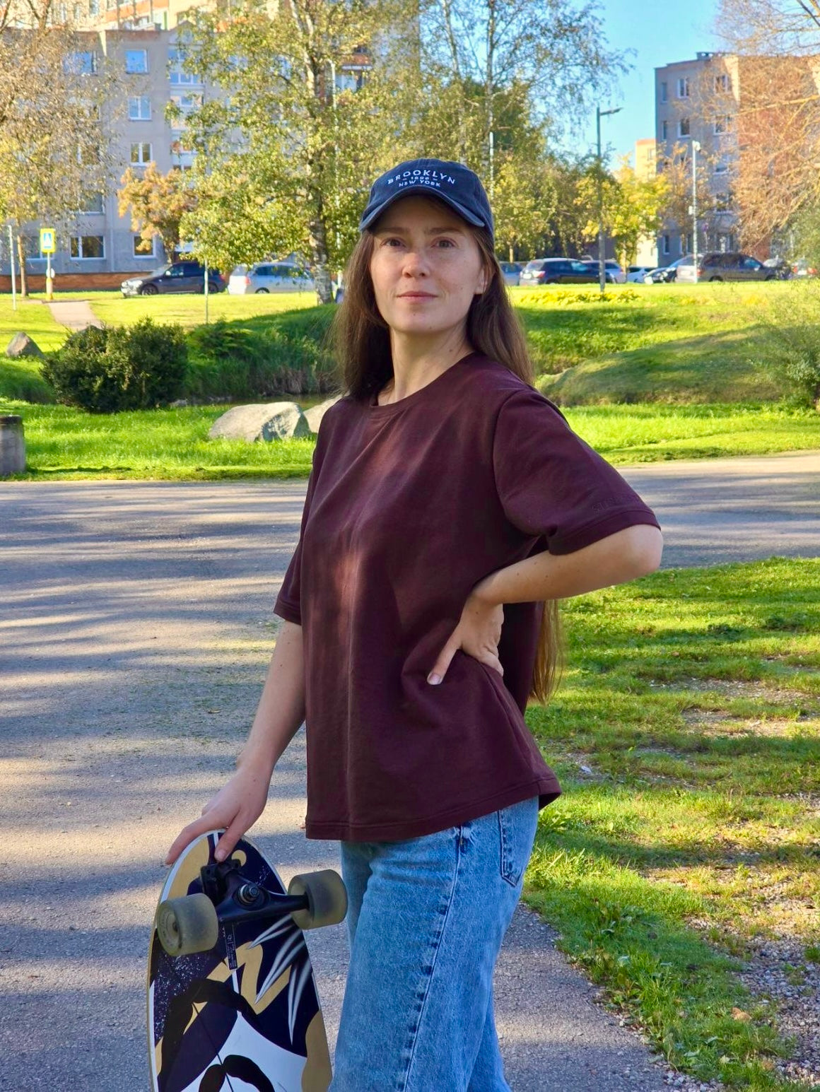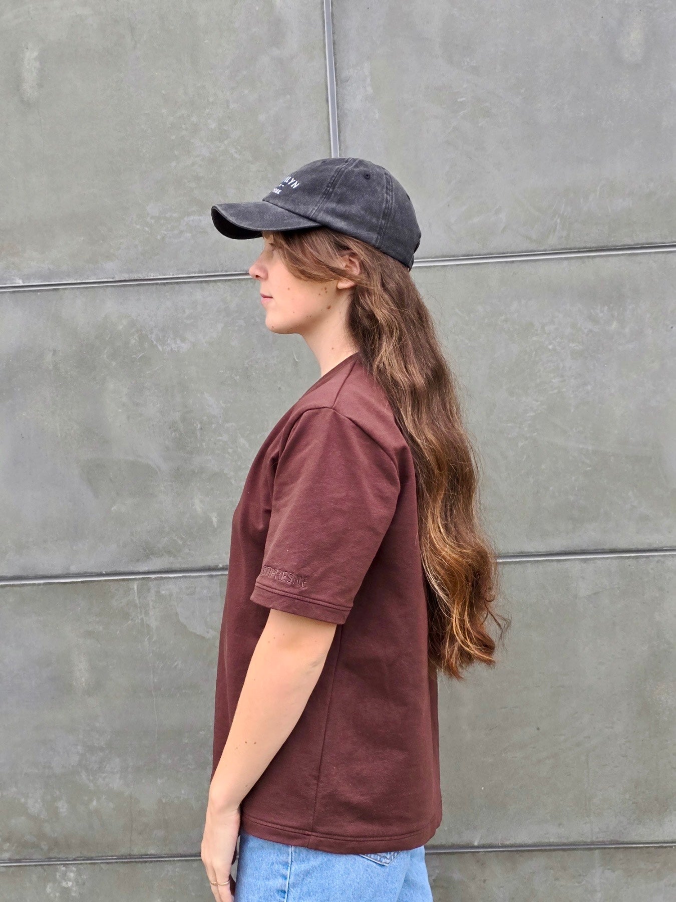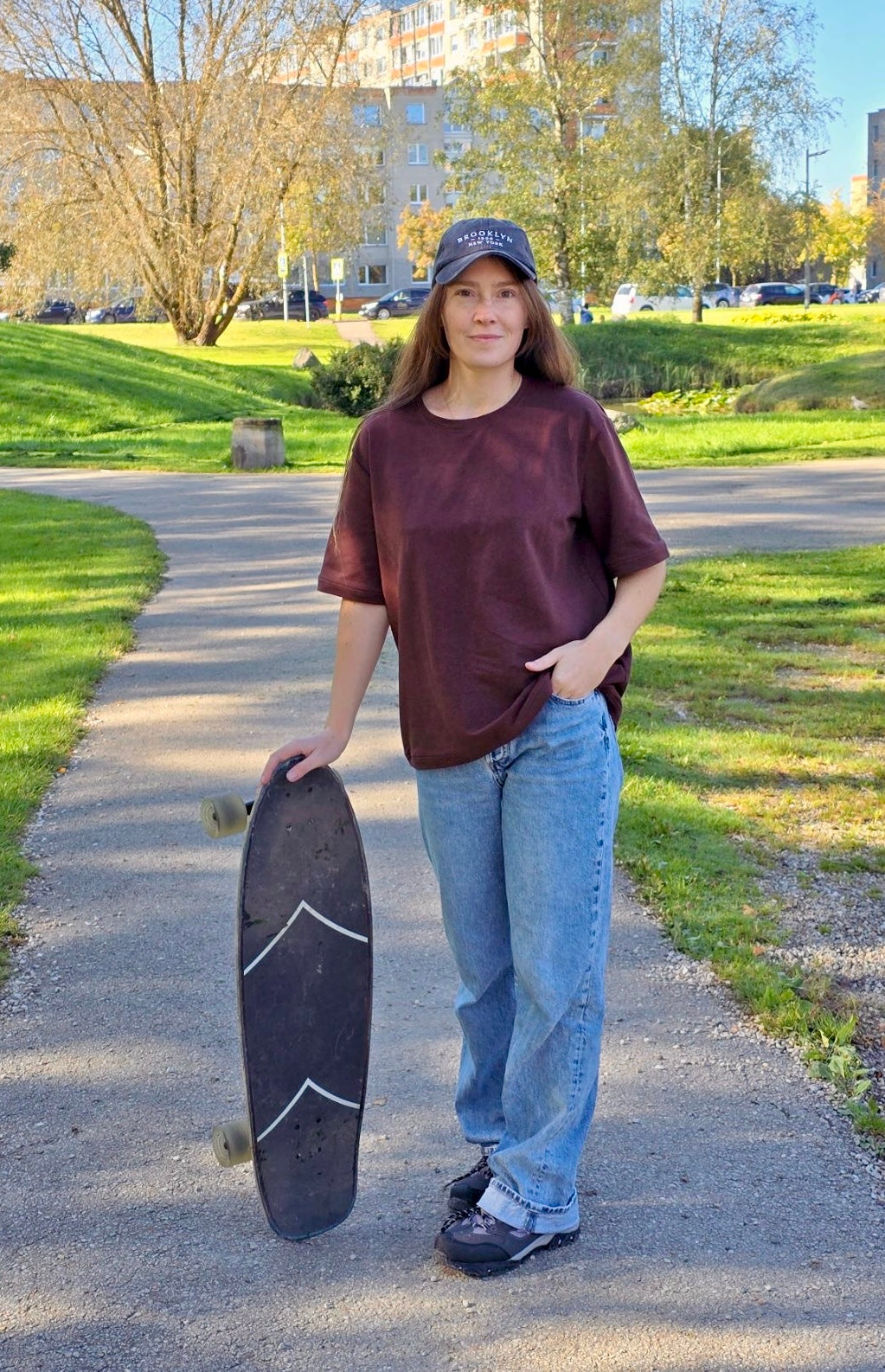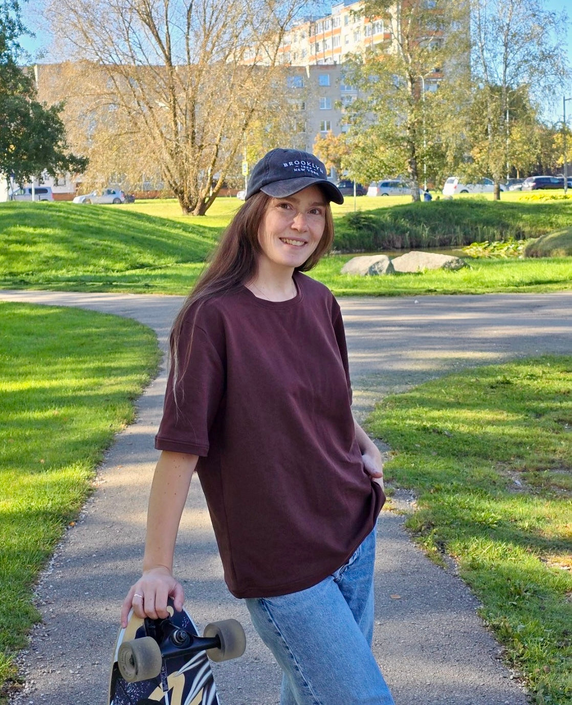 Oversize tipo marškinėliai trumpomis rankovėmis rudos spalvos